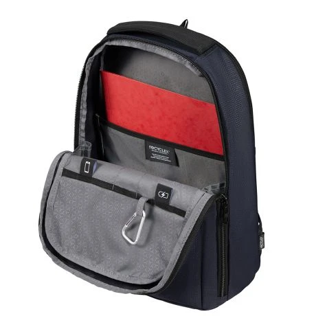 De rugtas is voorzien van ergonomische schouderbanden en een in hoogte verstelbare borstriem aan de voorzijde. Het interieur is van gerecycled PET en is ruim in inhoud. Het laptopvak en tabletvak is apart te bereiken met een ritsvak. Aan de achterzijde zit een smart sleeve zodat je de rugzak over een trekstang van een koffer kunt zetten tijdens reizen.